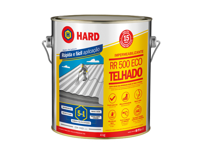 HARD RR500 ECO es un agente impermeabilizante de alto rendimiento y baja viscosidad, desarrollado en tecnología MS Polymer para sellos y protección anticorrosión para áreas exteriores. Después de la aplicación forma una membrana impermeable, adhesiva y muy elástica. No contiene disolventes, isocianatos y estirenos, siendo amigable con el medio ambiente. Disponible en latas de 4 kg en gris y blanco.